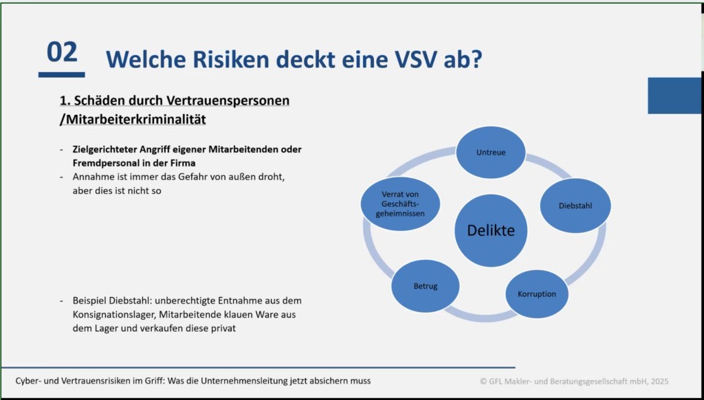 Eigenschäden: Betrug, Diebstahl, Veruntreuung und Computermissbrauch durch Mitarbeitende oder externe Vertrauenspersonen- Fremdschäden: Schadenersatzforderungen Dritter, die durch das Handeln interner Personen ausgelöst werden – z. B. wenn ein Mitarbeiter einen Dritten täuscht und das Unternehmen hierfür haftet.